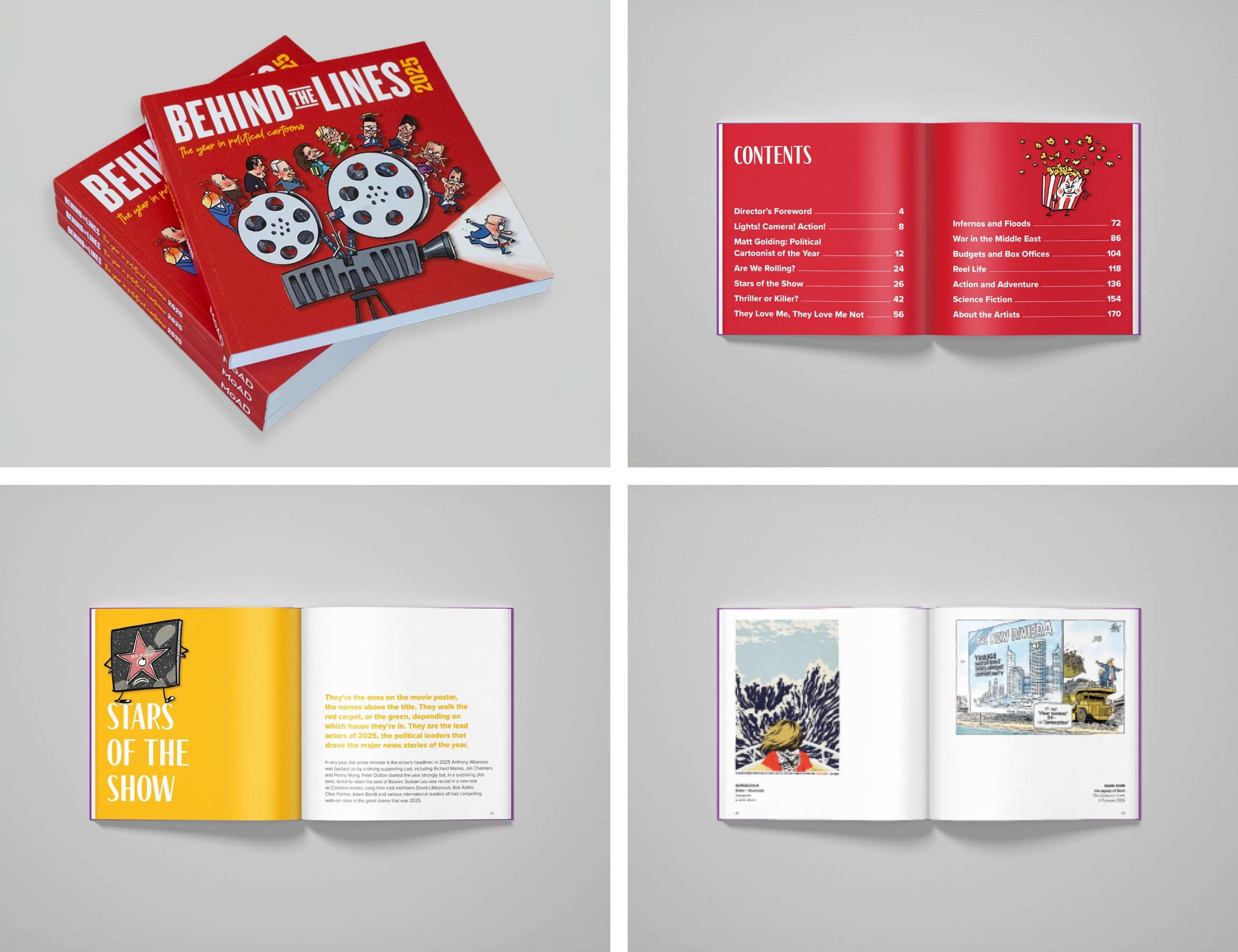 Cinematic colour and typography create a strong framework for storytelling, allowing the work of the cartoonists to remain central while maintaining a cohesive and contemporary tone. The catalogue functions both as a record of the exhibition and as a lasting time capsule of the political and cultural landscape of the year.
